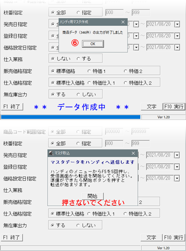 ⑥-ハンディ用マスタ作成「商品データ(○○件)の出力が終了しました」と表示されますので「OK」を押してください。