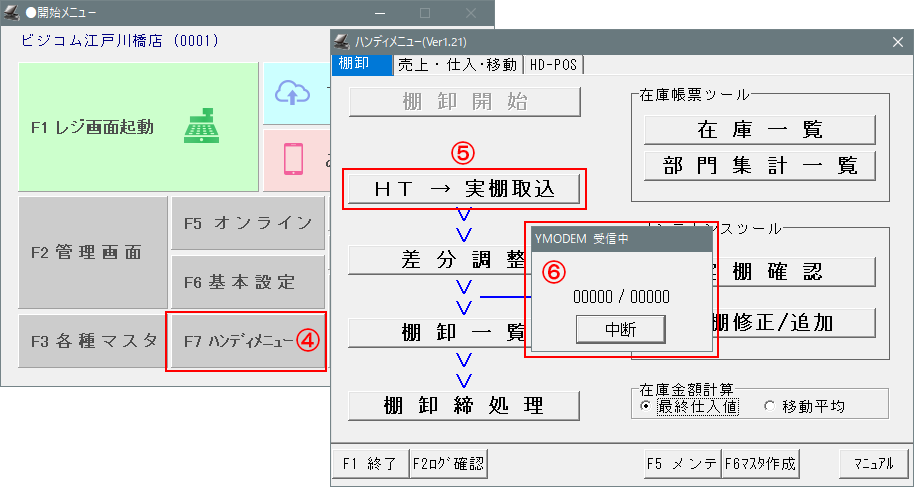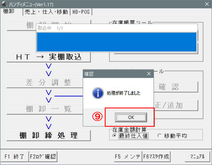 ⑤-「棚卸開始」後のメニュー>「HT→実棚取込」を押します。