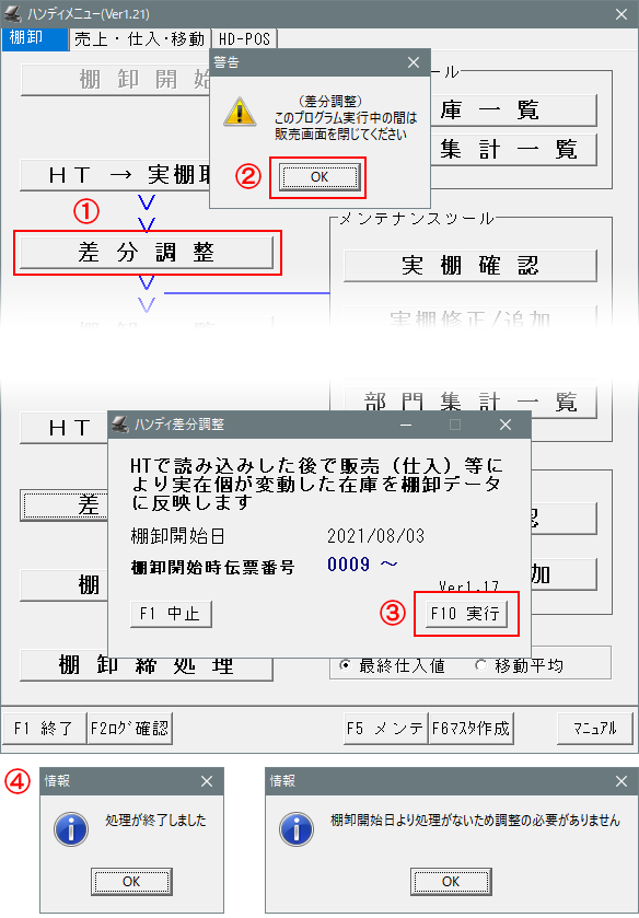 ①-BCPOS「F7ハンディメニュー」>「棚卸開始」後のメニュー「差分調整」を押します。