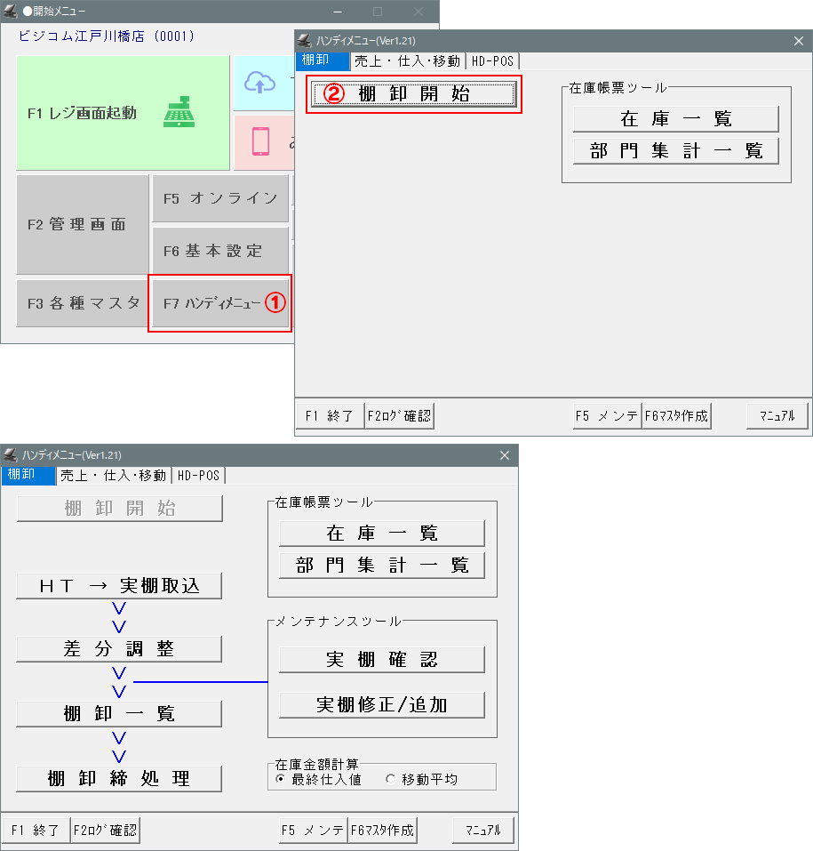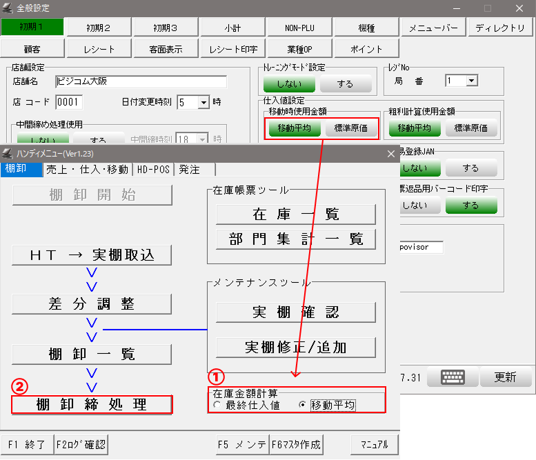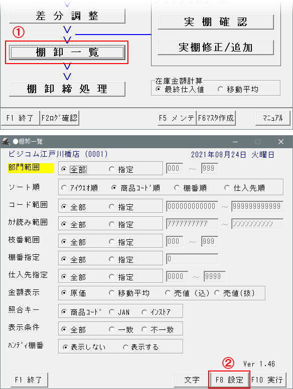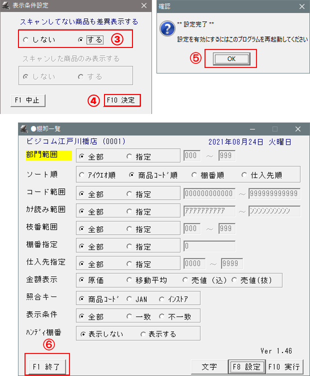 ⑥-設定を有効にする為に「棚卸一覧」を「F1 終了」を押して終了してください。
