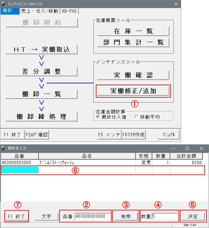 ①-BCPOS「開始メニュー」>「F7ハンディメニュー」>「棚卸開始」後のメニュー「実棚修正/追加」を押します。