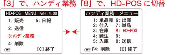 ※画面が「HD-POS」の場合「3」を押してハンディ業務にします。