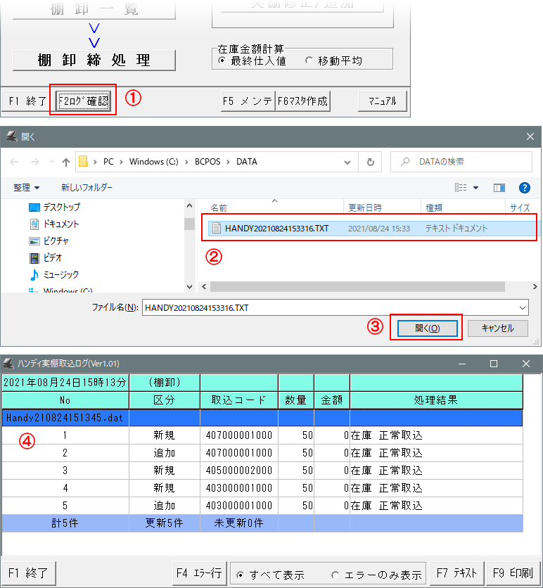 ①-BCPOS「F7 ハンディメニュー」を開き、「F2 ログ確認」を押します。