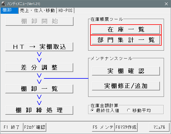 開始メニュー「F7 ハンディメニュー」>「棚卸」タグ内の「在庫帳票ツール」で「在庫一覧」を選択します。