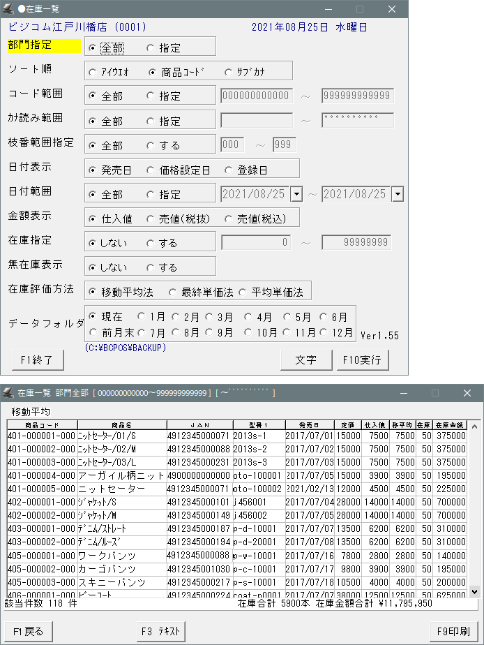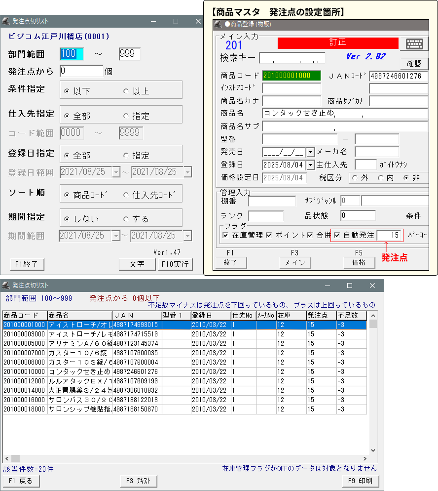 ②-「発注点切れリスト」「項目別商品在庫一覧」「コード検索在庫一覧」が見られます。