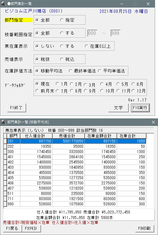 開始メニュー「F7 ハンディメニュー」>「棚卸」タグ内の「在庫帳票ツール」で「部門集計一覧」を選択します。