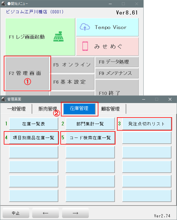 ①-「開始メニュー」>「F2 管理画面」>「在庫管理」タグを開きます。