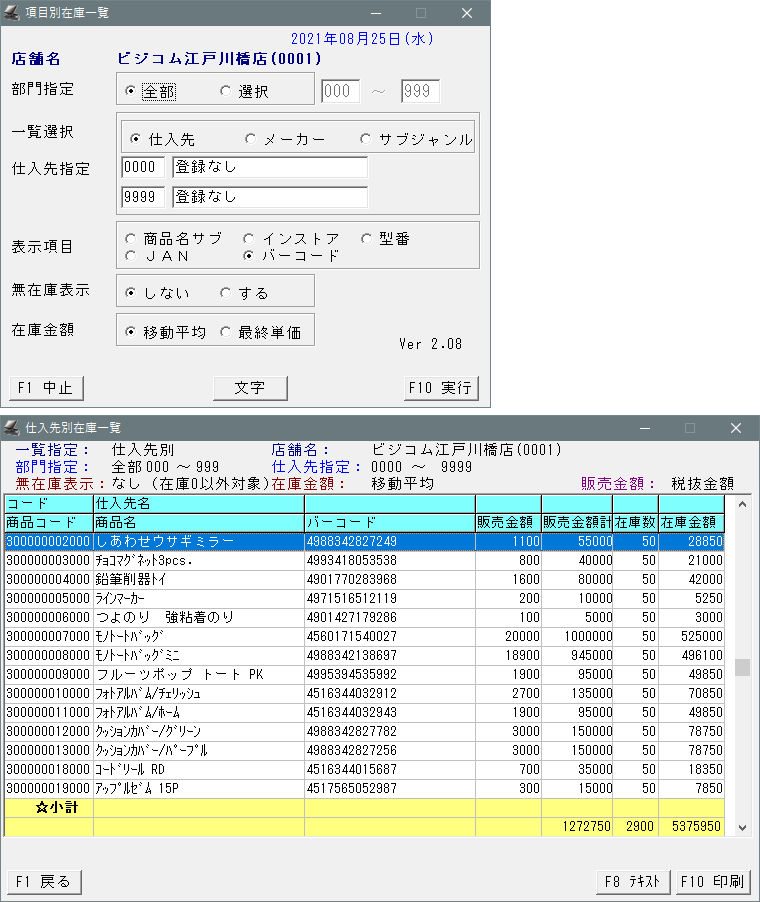 仕入先・メーカー・サブジャンルなど各項目や範囲を指定した在庫一覧が表示可能です。