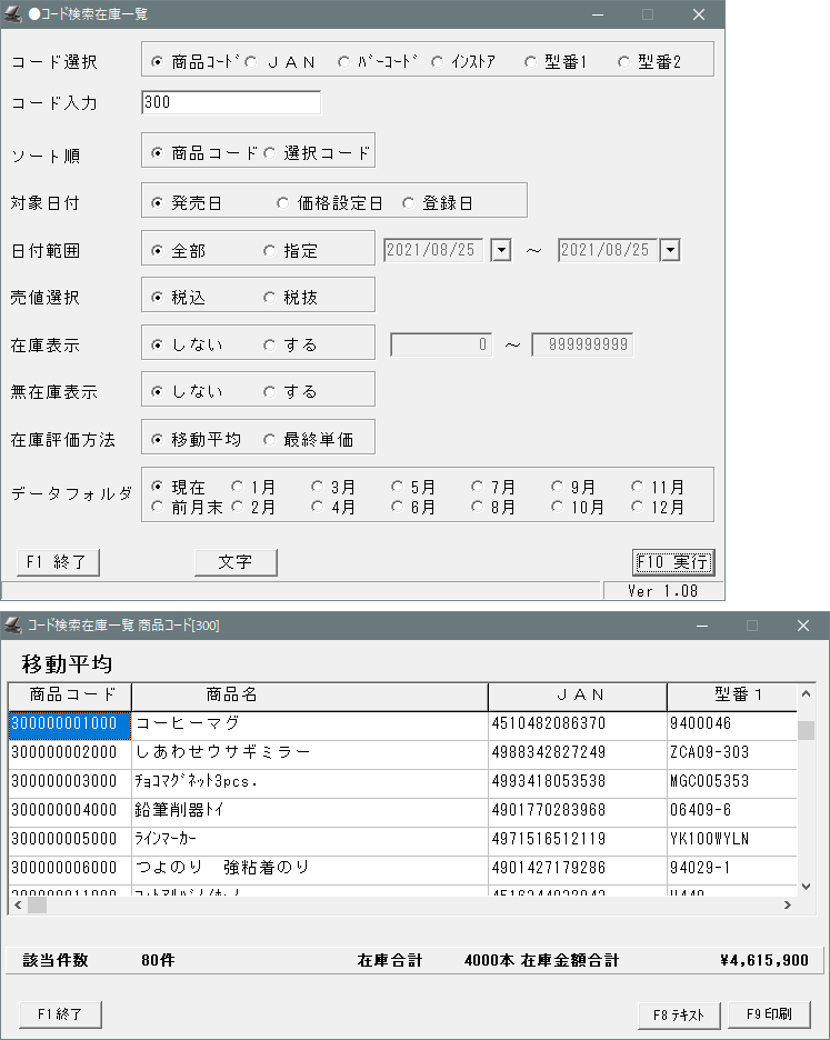 各種コードから在庫数を一覧表示します。