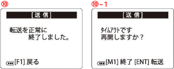 ⑩-1「タイムアウトです。再開しますか」と表示された場合は「ENT」を押して再度転送をしてください。