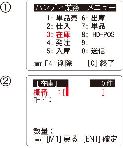 ①-ハンディ業務TOPメニューで「3」を押します。