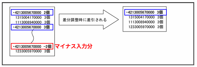 数量にカーソルがあたっている時に「F3」を押すと、マイナスの数量として登録でき、後述の差分調整で差引いて調整されます。