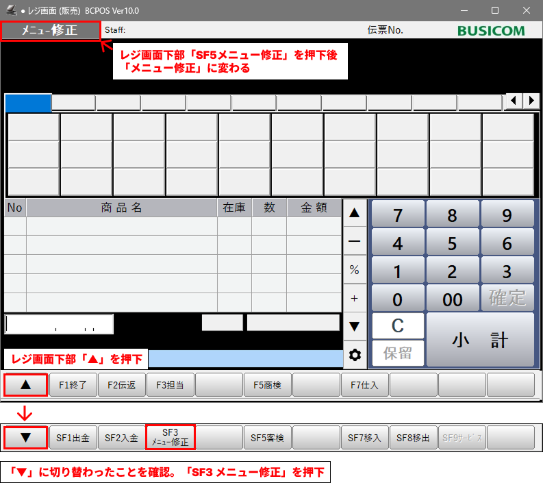 「SF3メニュー修正」ボタンを押して、「メニュー修正」モードにします。