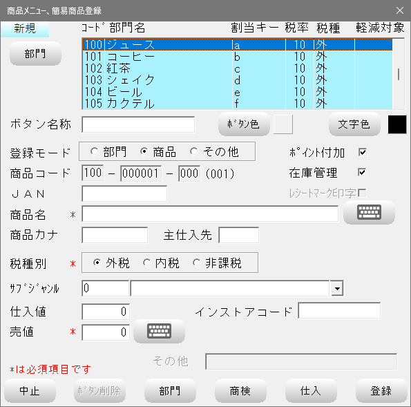 レジ画面で登録したいメニューボタンを押すと「商品メニュー、簡易商品登録」画面が開きます。