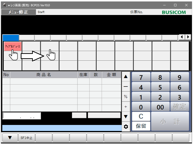 メニュー修正モード(レジ上部の表示「メニュー修正」)に変更後、入れ替えしたいタブやボタンを長押し(マウス操作時は右クリック)して移動先へ移動します。