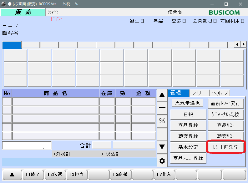 当日のレシートを再発行したい場合「F8前へ」「F9次へ」を押して対象となるレシートを表示させて「F10」印刷を押す事で再発行出来ます。