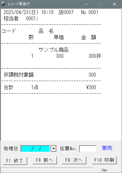 当日以外のレシートを再発行したい場合処理日を発行したい日付に変更して「F8前へ」「F9次へ」で伝票を探して再発行してください。