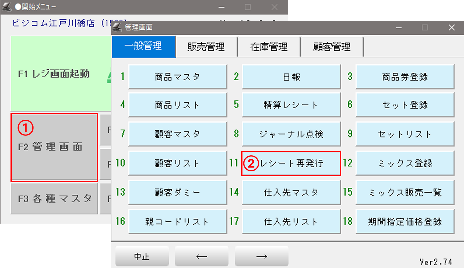 ①-開始メニュー「F2 管理画面」を選択します。
