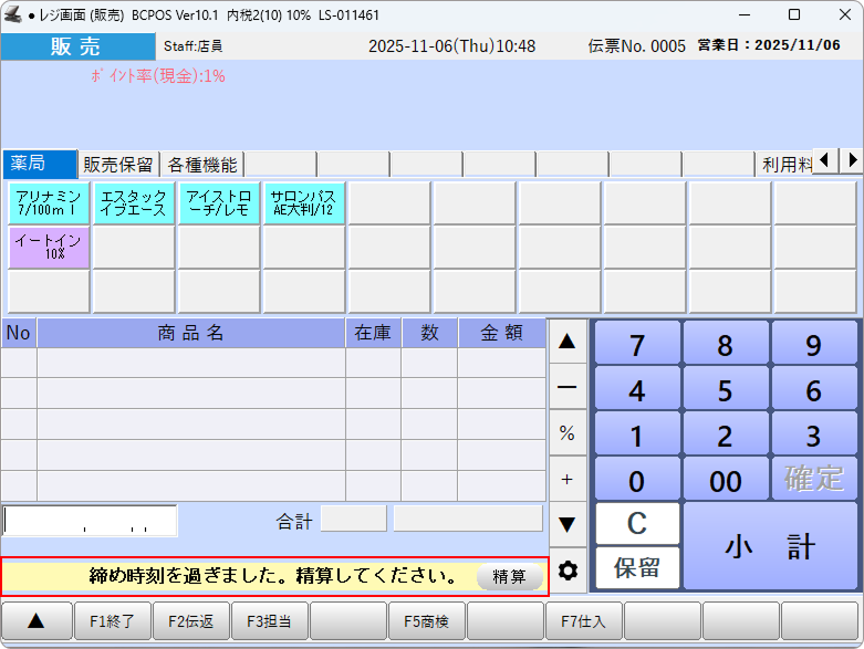 ①-設定した時刻を過ぎると、レジ画面下部に「締め時刻を過ぎました。精算してください」と表示がされますので「精算」ボタンを押してください。