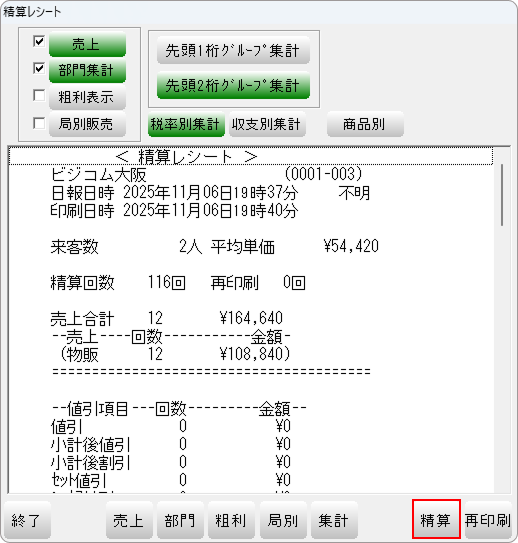 ②-「精算レシート」が表示されますので「精算」を押してください。精算レシートが出力されます。