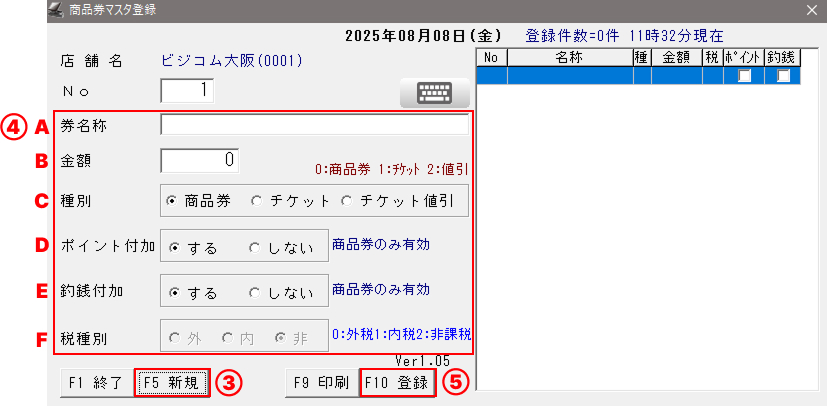 ⑥-「ポイント率」:商品券利用時に付与するポイント率※0にした場合はポイント付与しません。