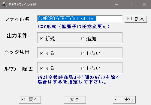 前項の画面下部「F4 CSV」を押すと、「テキストファイル作成」画面が表示されます。