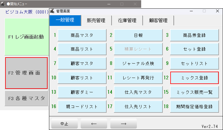 「開始メニュー」 > 「F2 管理画面」 > 「ミックス登録」を開きます。