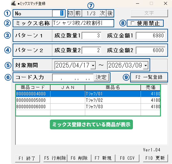 | ⑨F2 一覧登録 | 商品マスタ一覧からミックスマッチ登録ができます。 詳しい登録方法はこちら |