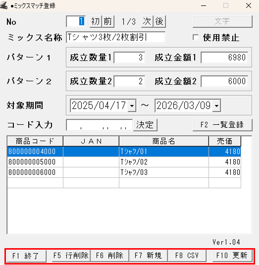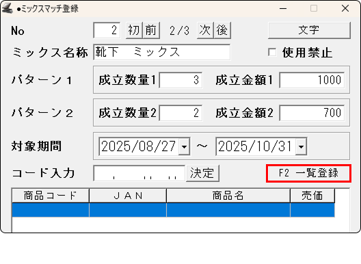 ①-「ミックスマッチ登録」画面の「F2 一覧登録」を押してください。