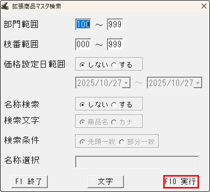 ②-「拡張商品マスタ検索」画面が開きますので、商品マスタを表示する範囲等の設定をして「F10実行」を押します。