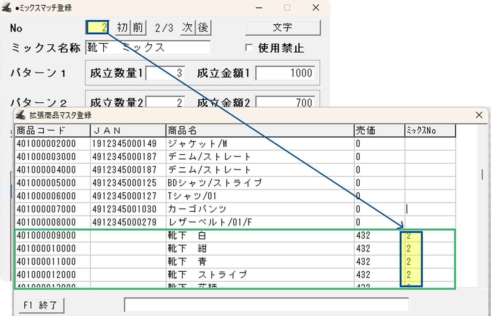 ④-指定したNoのミックスマッチ登録にミックス商品として登録がされ、緑枠部分に表示されます。