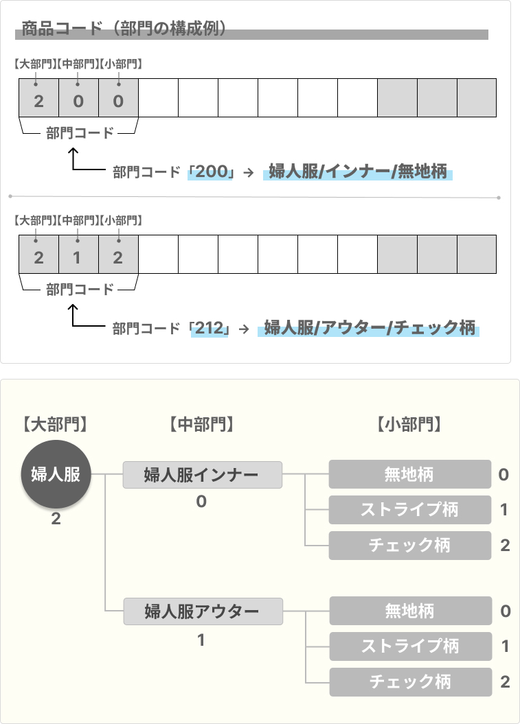 部門コードは、商品を「大部門 → 中部門 → 小部門」のように階層的に分類できます。