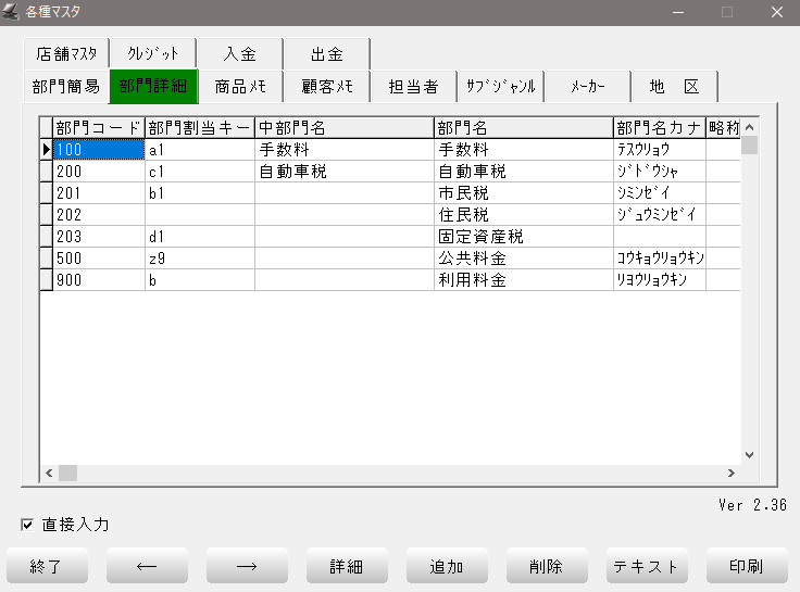 編集画面を開かずに直接入力したい場合は、前項の部門登録(詳細)画面の左下「□ 直接入力」にチェックをいれてください。