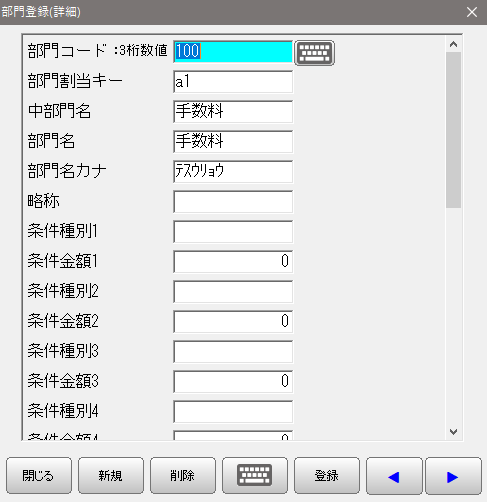 前項の部門登録(詳細)画面の下部にある「詳細」ボタンを押すことで、選択中の部門コードに対応する編集画面を開くことができます。