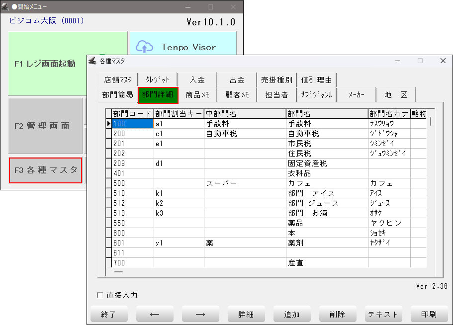 「開始メニュー」 > 「F3 各種マスタ」 > 「部門詳細」タブを開きます。
