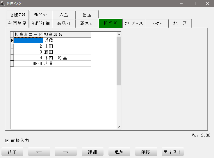 編集画面を開かずに直接入力したい場合は、前項「担当者」マスタの左下「□ 直接入力」にチェックをいれてください。