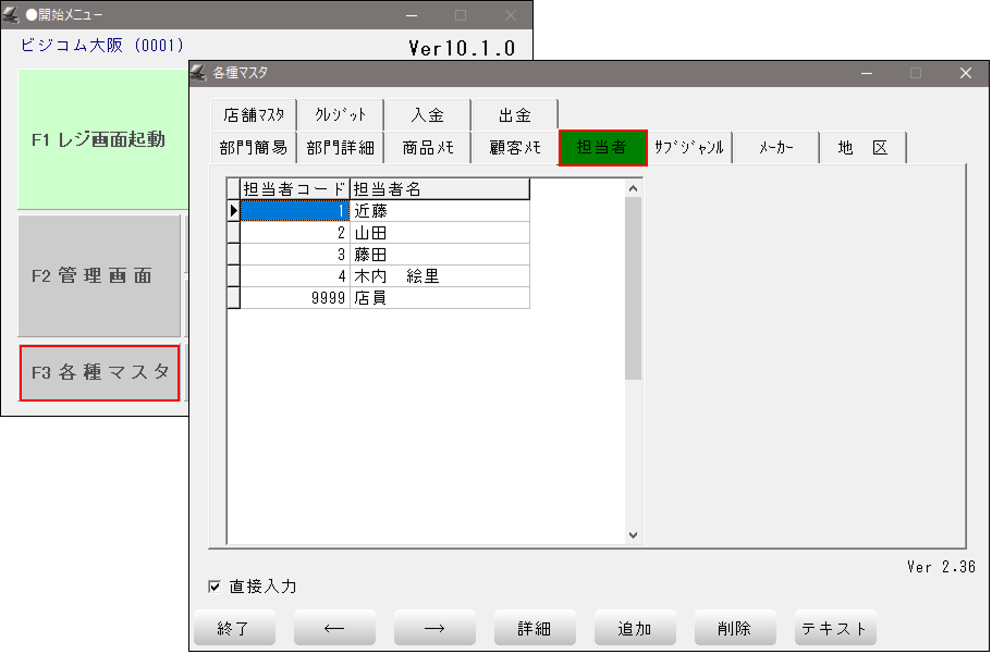「開始メニュー」 > 「F3 各種マスタ」 > 「担当者」 タブを開きます。