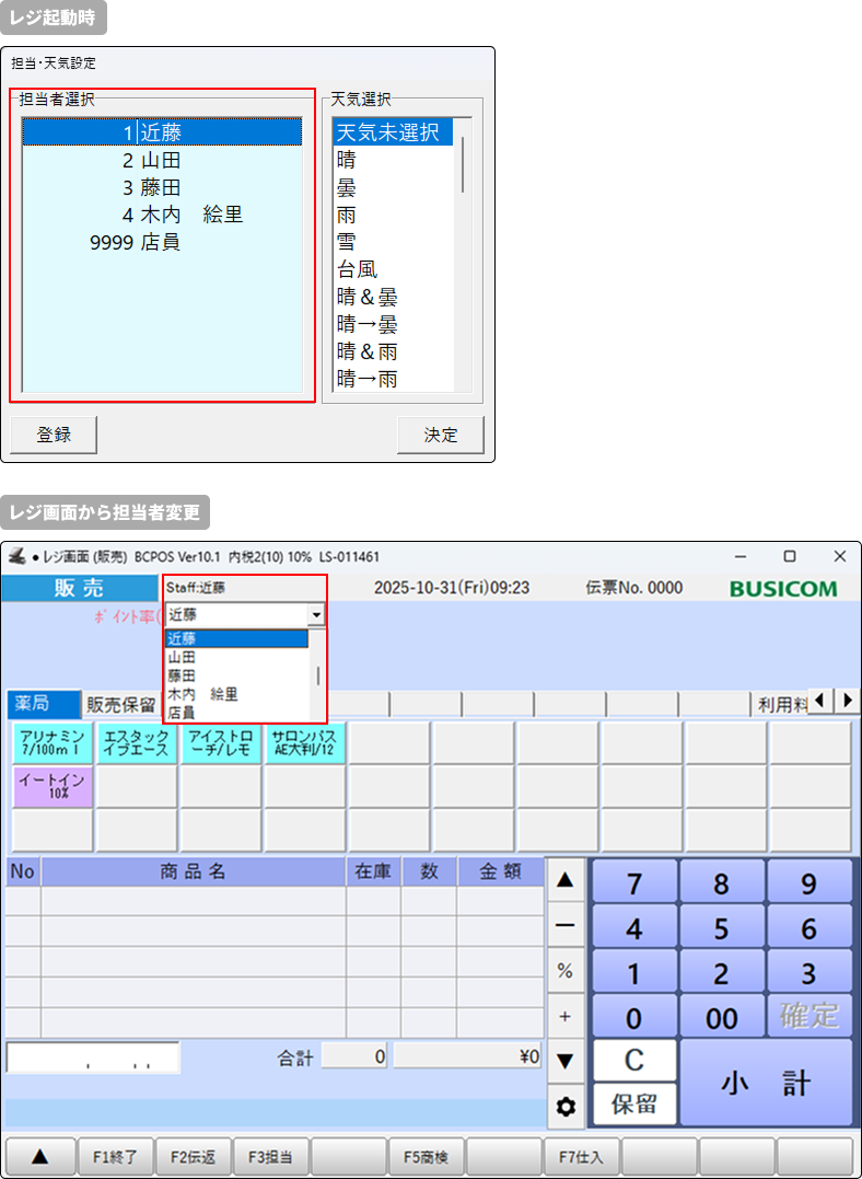 レジ担当者を管理する場合、担当者を登録出来ます。登録された担当者が選択肢として表示されます。