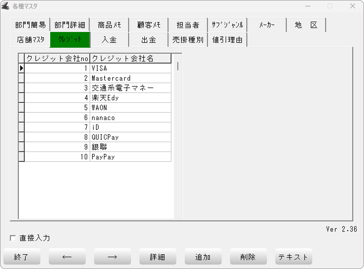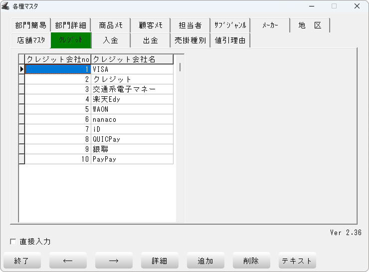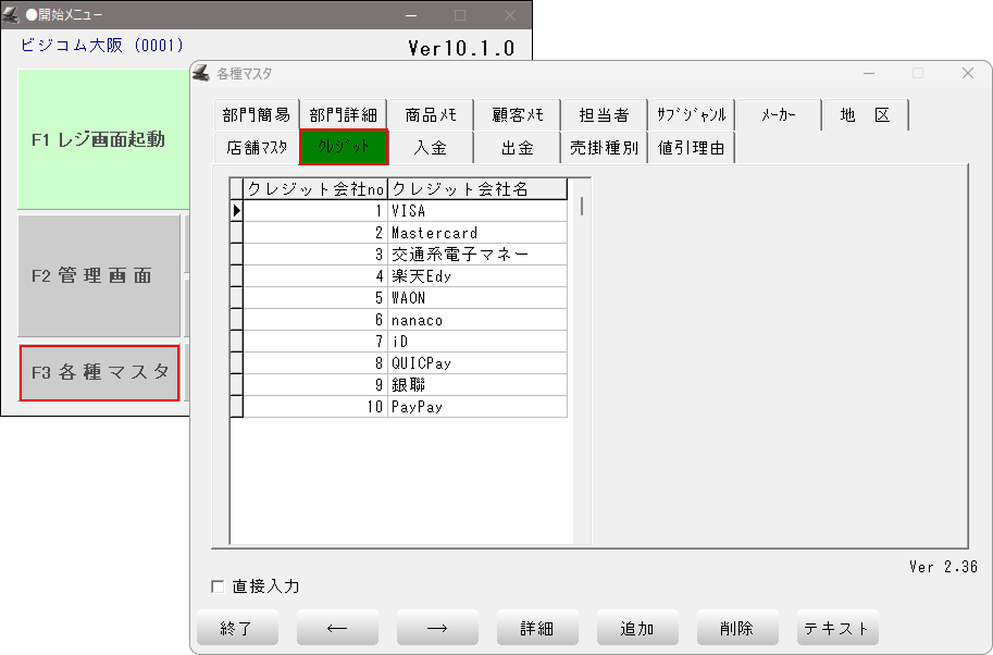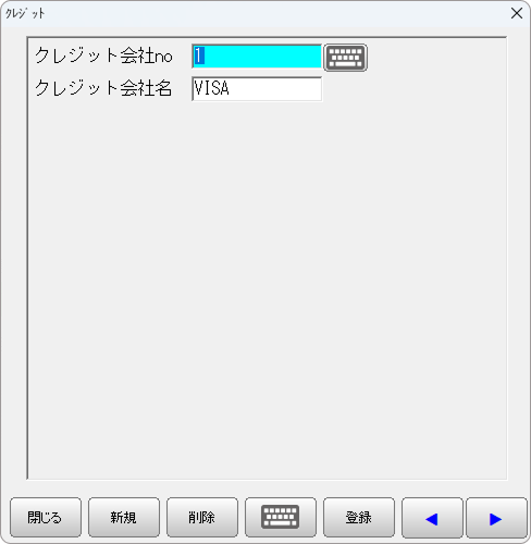 ※決済端末連動時は「開始メニュー」>「F6基本設定」>「F10決済連携設定」を設定することで、自動的にクレジットマスタに登録がされますので登録操作は不要です。