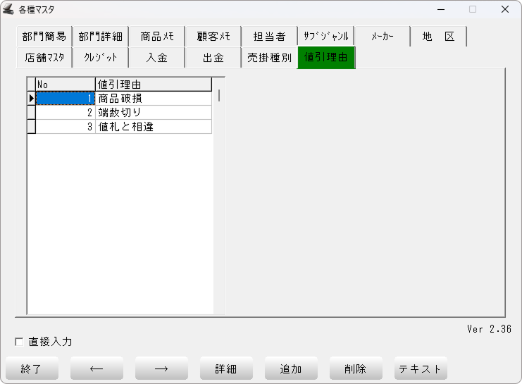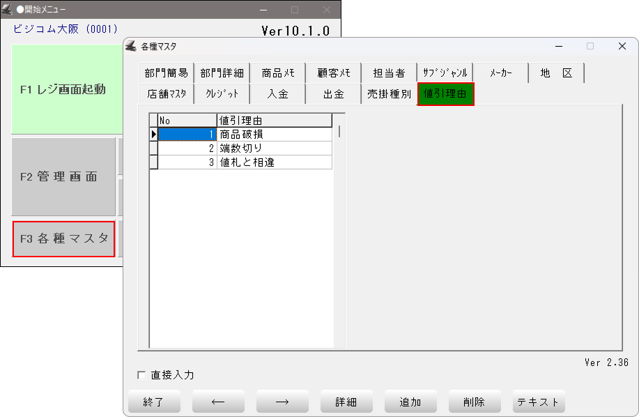 「開始メニュー」 > 「F3 各種マスタ」 > 「値引理由」 タブを開きます。