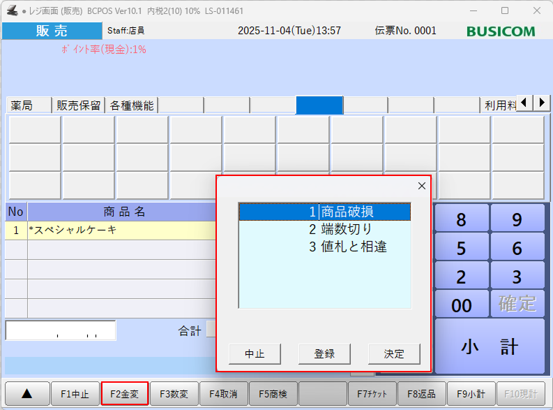 商品を選択した状態で「F2 金変」ボタンを押すと、登録された値引理由の一覧が表示され、該当項目を選択することで簡単に登録できます。