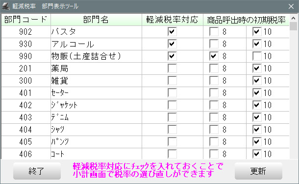 | 軽減税率 部門表示 | 軽減税率設定の部門を表示:軽減税率商品が含まれる部門にチェックを入れ、商品呼出し時の初期の税率(8% or 10%)にチェックします。 「軽減税率部門表示ツール」 |