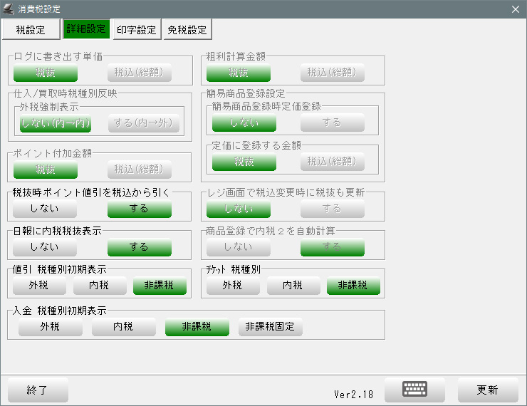 | 免税機能使用 | 免税販売が有る場合 [する] に設定。 |