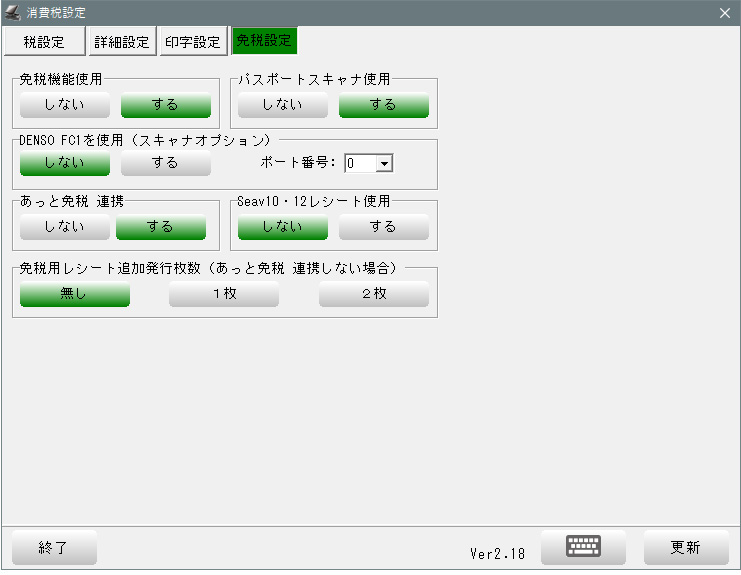 | 免税レシート追加発行枚数 | 免税販売時にレシートを追加で発行します。 |