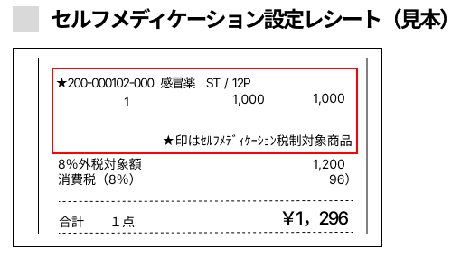 | セルフメディケーション設定 | 商品マスタで「レシートマーク印字」の設定をした商品は、レシート印字の際に商品名の先頭に★マークを印字、下段に設定項目を印字します。(設定例)「★印はセルフメディケーション税制対象商品」 |