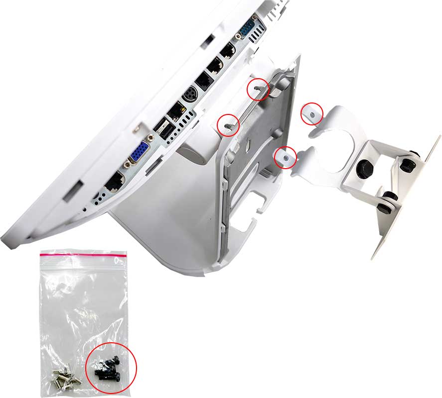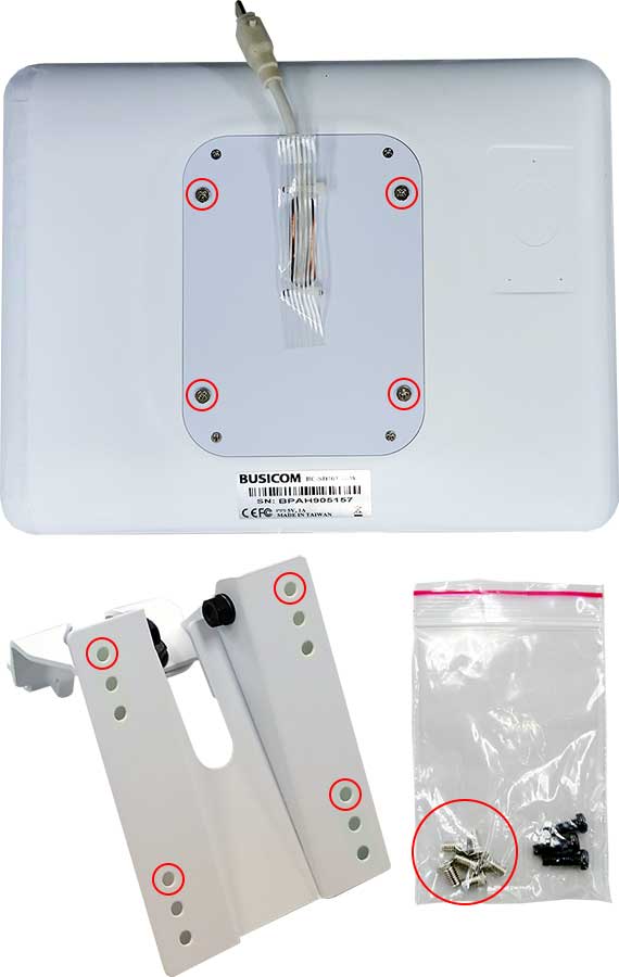 ④-金具の丸印と、10インチタッチパネルモニターの丸印を、下記のネジでネジ止めします。