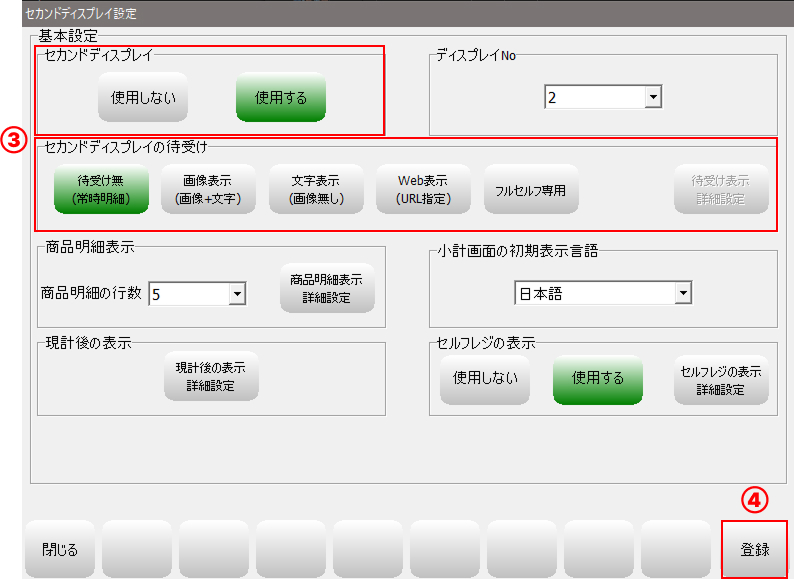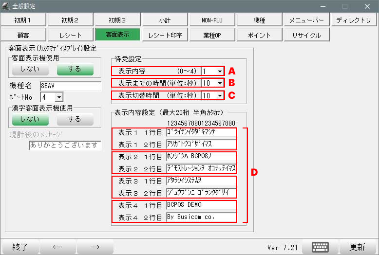 客面表示機設定は、レジ操作されていない時に、任意のコマーシャルを客面表示機へ流します。