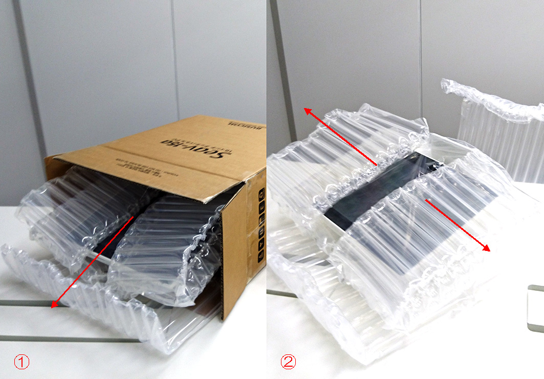 ①-ディスプレイが上にくるように箱を横に倒し、梱包材と一緒に手前に引き出します。