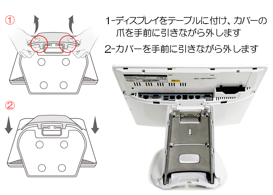 ①-本体のディスプレイ面をテーブル側にして倒します、背面カバー(ケーブルカバー)の爪を手前に引きながら外します