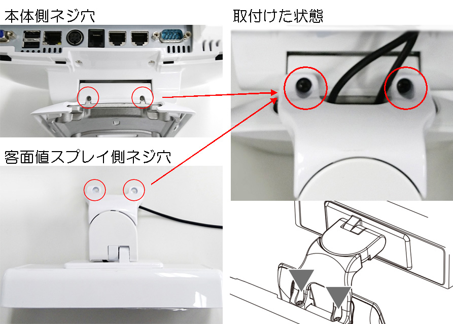 ⑤-取付け金具と10インチタッチパネルモニターの丸印とSeav15のマル印どうしを付属のネジでネジ止めします。